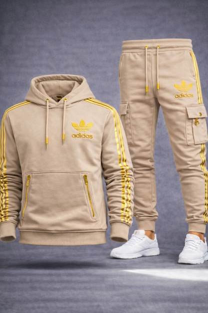 The Golden Heritage Tracksuit combines iconic sportswear style and premium details in an outfit designed to stand out. Made from soft, comfortable fabric, it features a hoodie and matching pants with functional pockets and a modern fit. The iconic three stripes and contrasting gold details give it a sleek, bold look, perfect for contemporary streetwear that combines comfort and character.