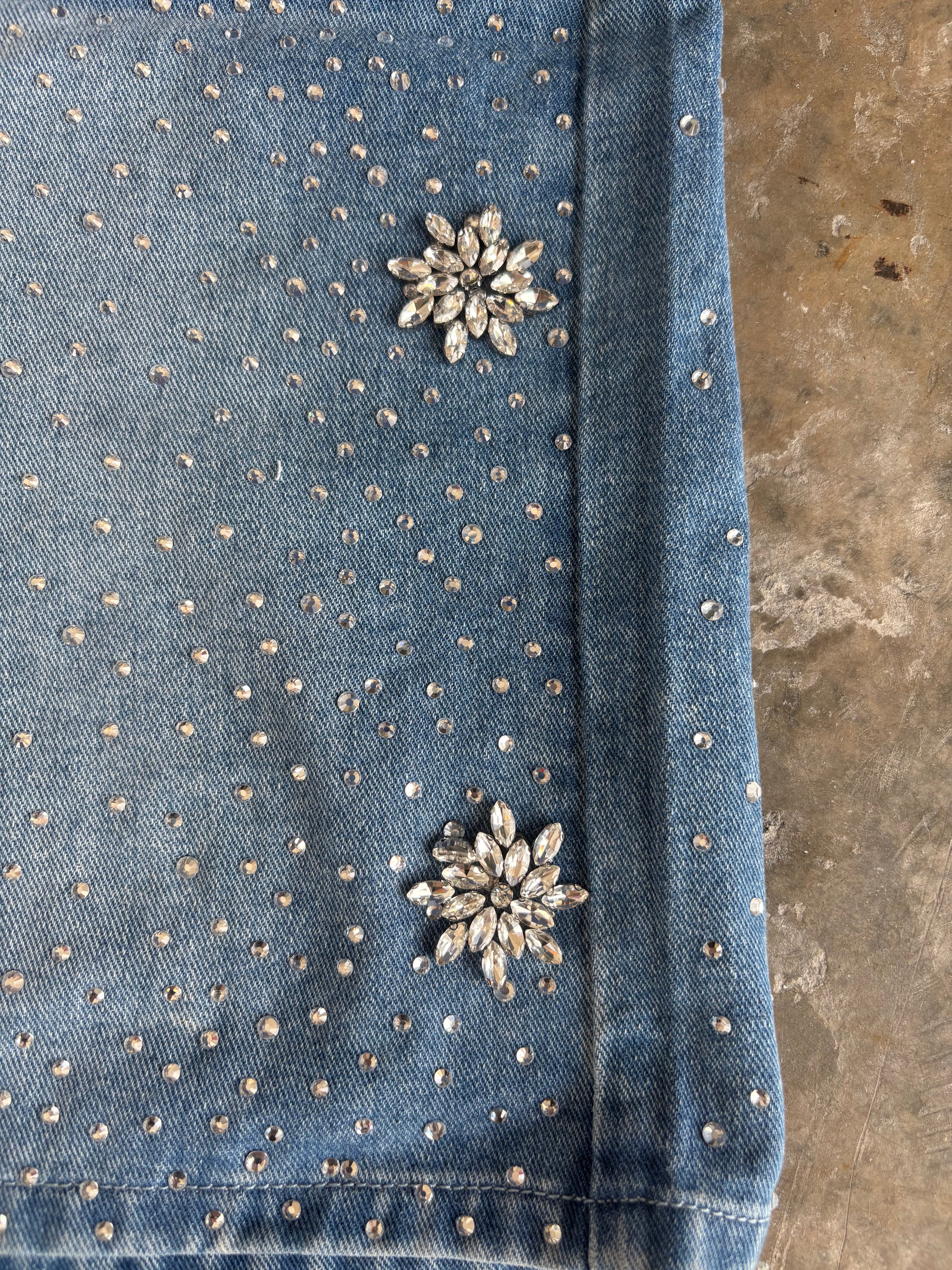 These 18oz denim jorts are fully flooded with rhinestones for a bold, dazzling look.