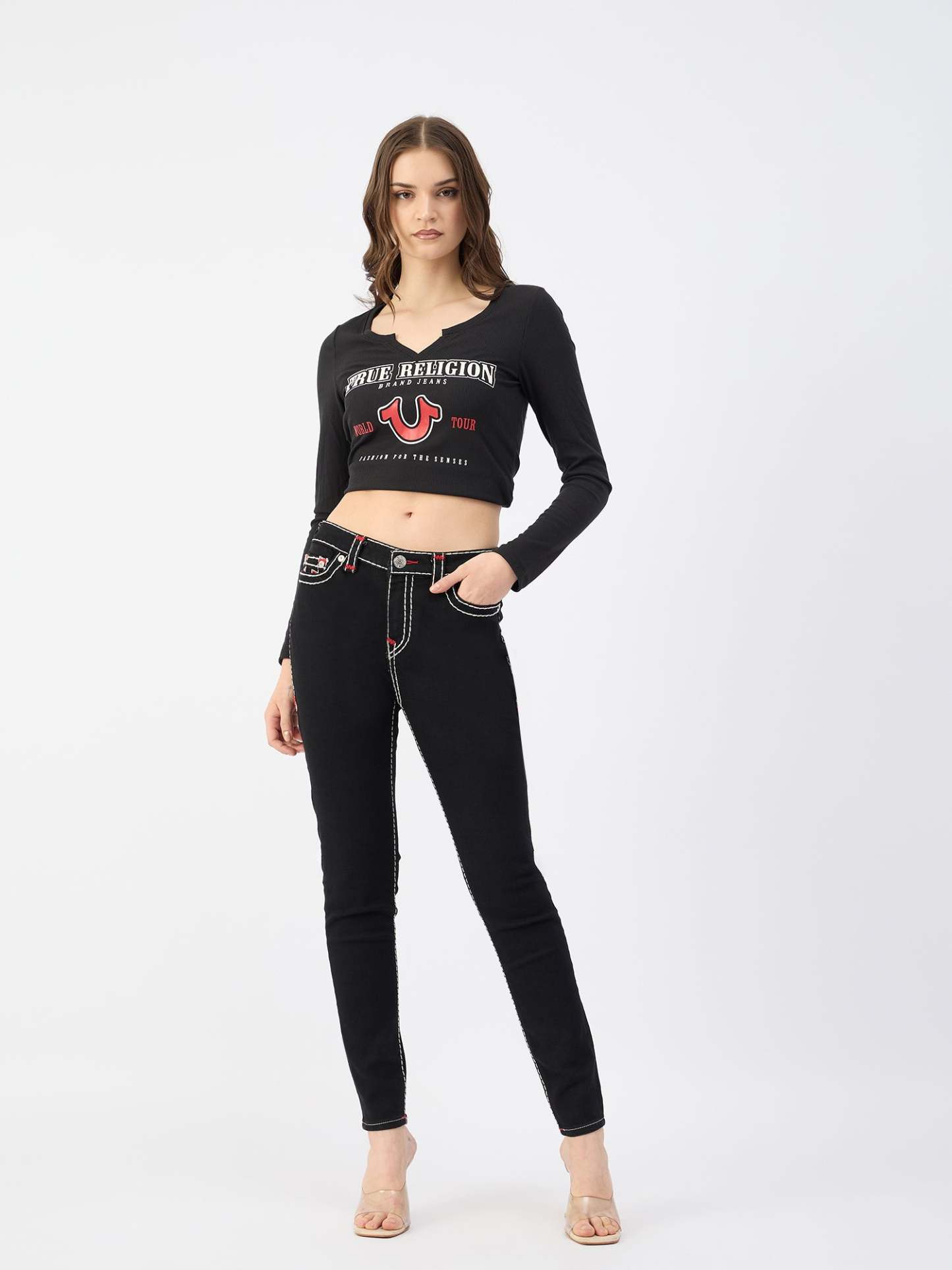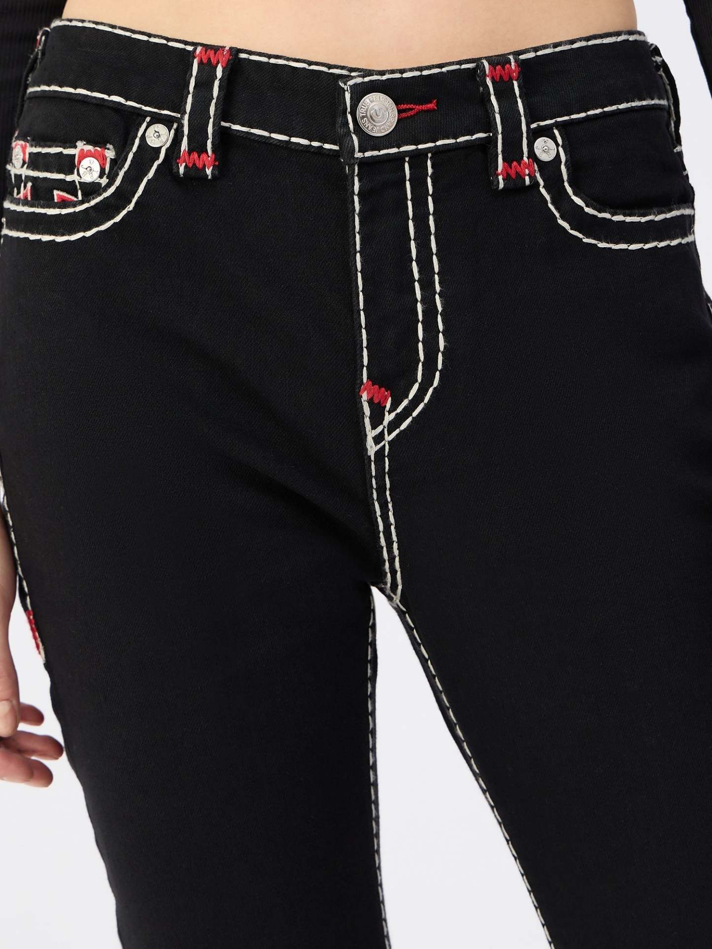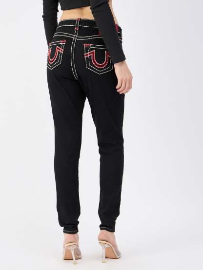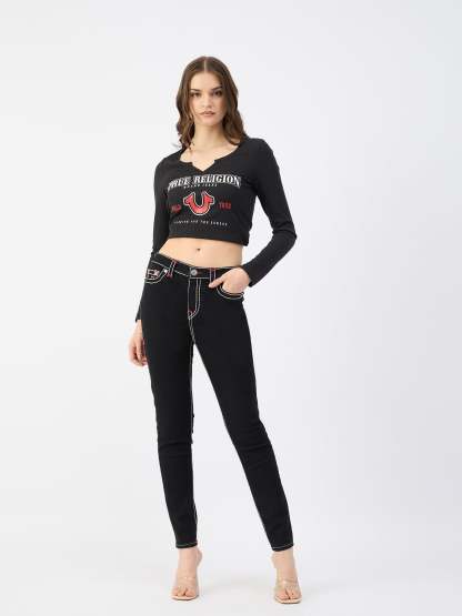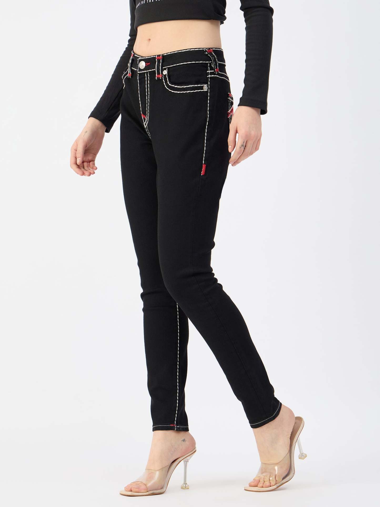 Black Skinny Jeans for Women. These mid-rise jeans are crafted from a comfortable poly cotton blend and feature a flattering skinny fit. The button and zipper closure ensures a secure fit. The solid pattern and timeless black color make these jeans a versatile wardrobe staple.