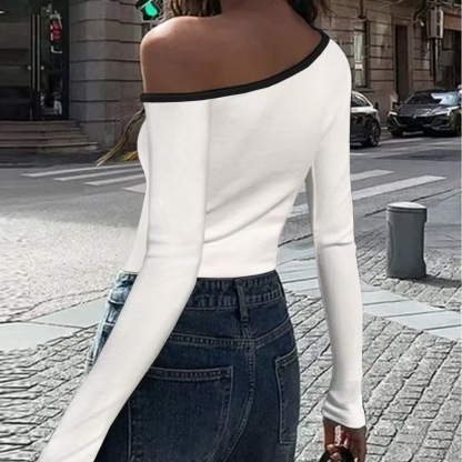 Women's Off-shoulder Contrast Color Long-sleeved T-shirt